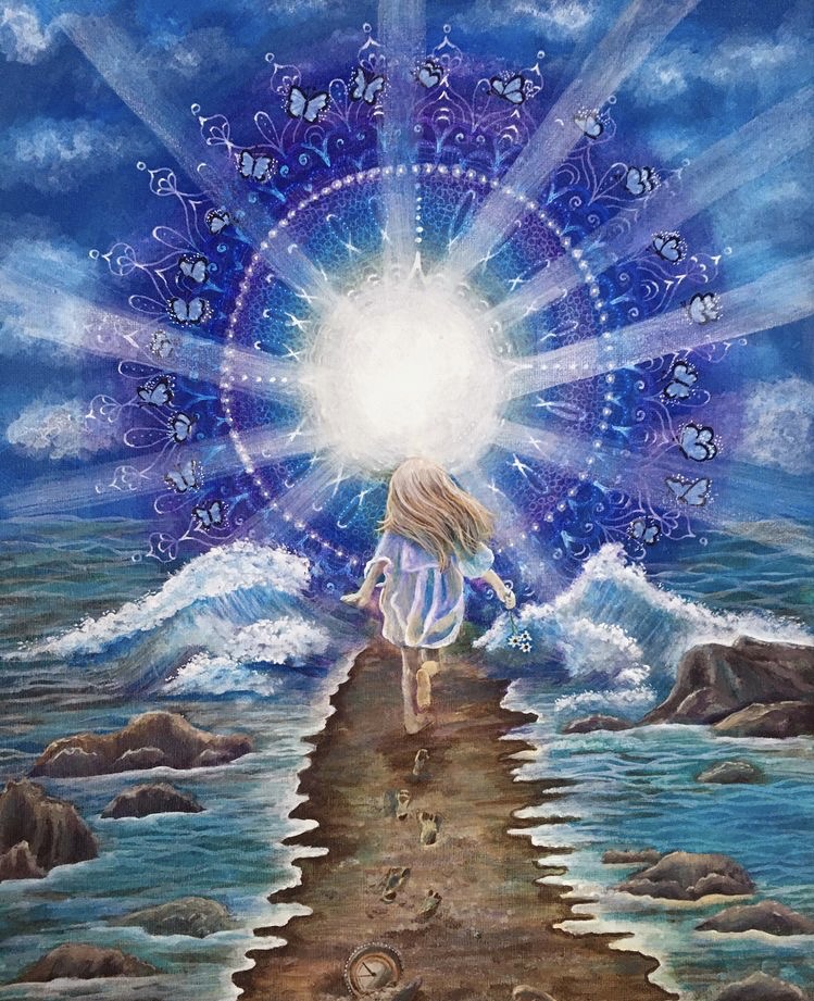 Görseller: Işığa yürüyen kız ve Baykuş – Veronica Wilde; Kadın ve bebek – Sue Ellen Parkinson