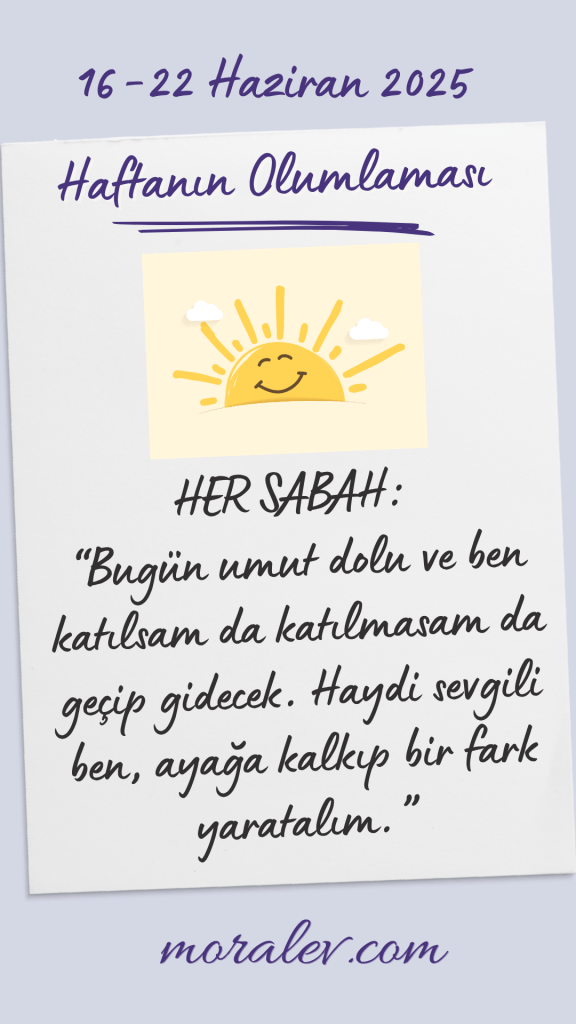 Geçen haftanın olumlamaları hala geçerli. (Bağlantısı burada) Ayrıca bu hafta içimizdeki umudu ve hayatı güzelleştirme arzumuzu besleyelim, günümüzün enerjisini erkenden belirleyelim diye bir sabah olumlamamız var.