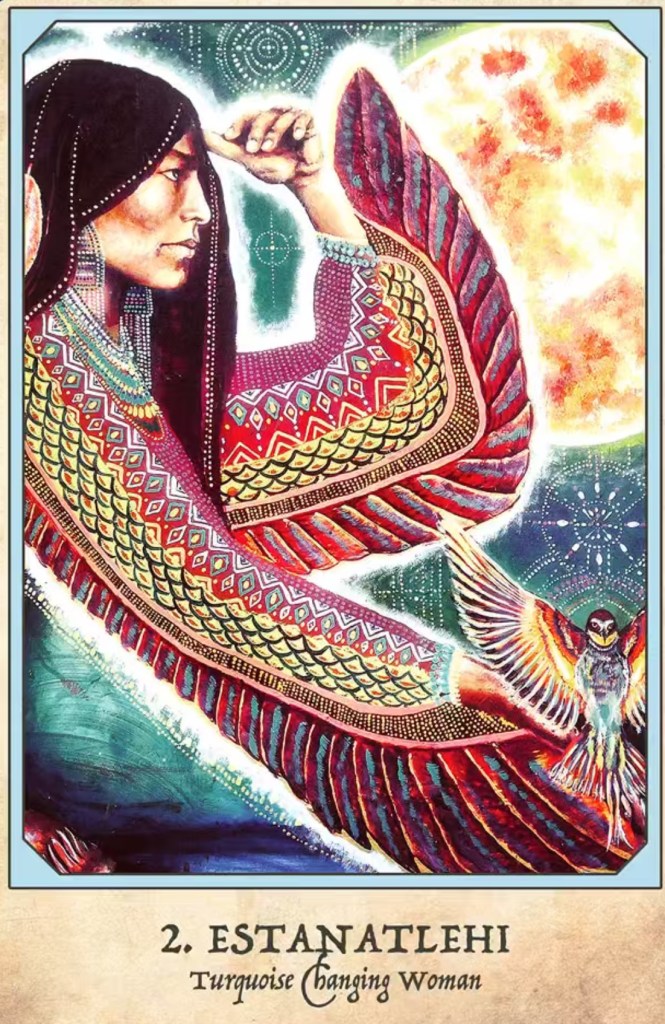 Estanatlehi, Navajo’ların Turkuaz Ay Tanrıçasıdır ve “Dönüşen Kadın” olarak bilinir. O sürekli değişir, ancak asla ölmez. Yaşlanmaya başladığında, doğuya, güneşin doğduğu ve her şeyin başladığı yöne doğru yürür ve orada yenilenir.