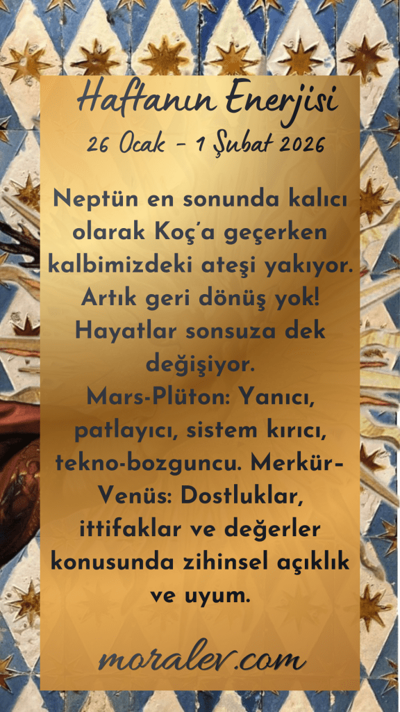 Bu haftanın ve aslında son 165 yılın büyük haberi Neptün’ün Pazartesi günü geri dönmemek üzere Koç’a, yeni bir astrolojik döngüye geçişi. Bu dev enerji ve etkilerini bu hafta ayrı bir paylaşımda bir defa daha konuşacağız Bilge Baykuşlar. Hepimiz, her birimiz değişiyoruz. Elimizde değil, hep değişiyoruz tabii ama bu bambaşka boyutta bir değişim.