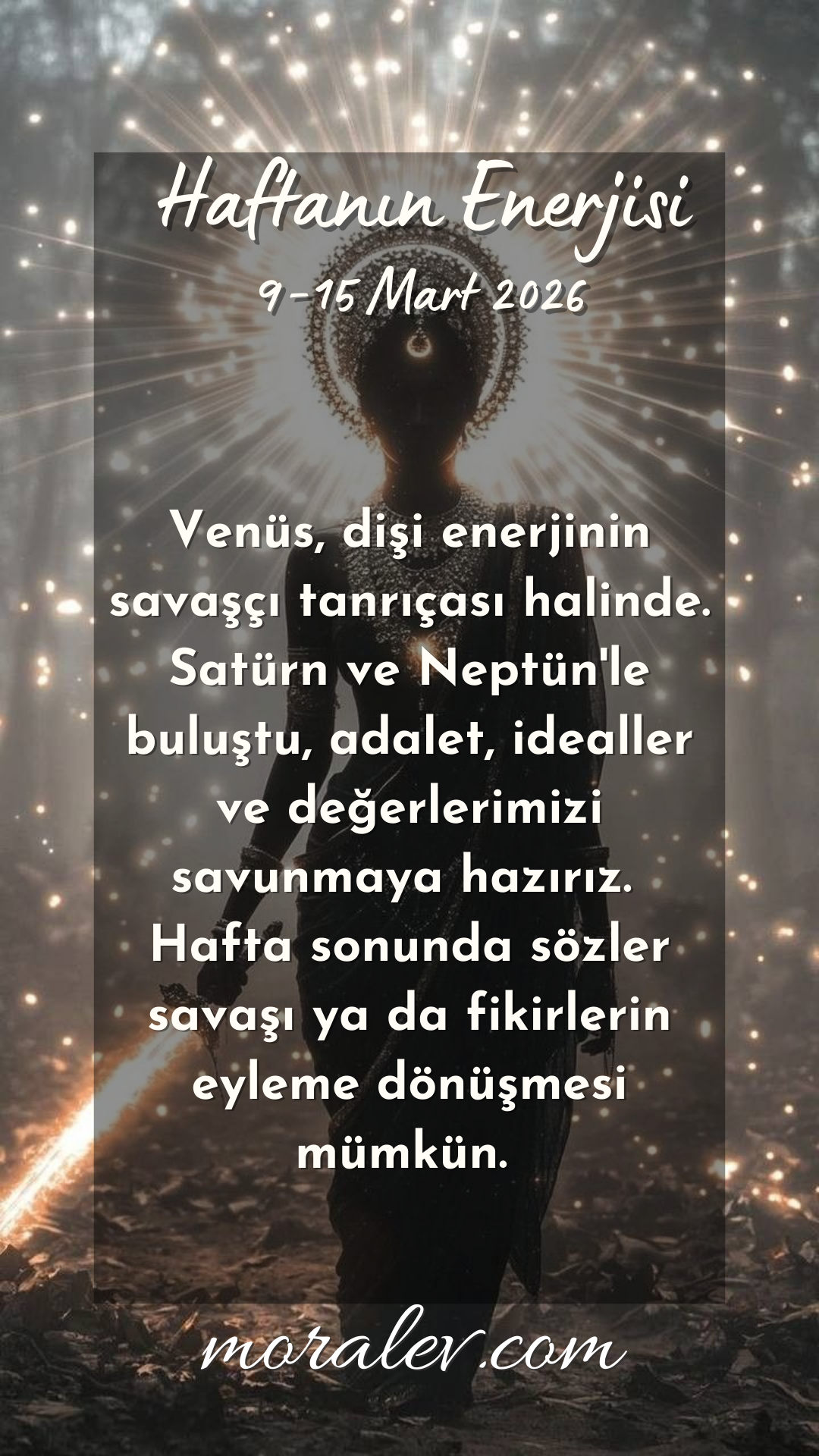 Venüs dişiyi temsil eder. Huzuru, sanatı, bolluğu, rahatı ve güzellikleri sever. Sosyal hayatımızı, dostluklarımızı, bir araya gelip şölen sofraları kurduğumuzdaki neşeli alanı yönetir. Eğer adalet ve barış yoksa, bunların hiçbiri olmaz. Adalet bize bütün bu güzellikleri yaşayacak güveni verir, üretken oluruz. Barış ve huzur ortamı sanatı, rahatlığı ve bolluğu besler. Bunların olmadığı ortamlarda denge bozulmuştur. Tarlalar boşalır, bolluk yokluğa döner, haksızlıklar ve sıkıntılarla baş etmeye çalışan insanlar gün batımındaki güzelliği görmekte, dostlarla gönülden paylaşmakta, kaygıdan sevgiye dönmekte zorluk çeker. Ve nerede adaletsizlik ve çatışma ortamı varsa, önce Venüs’ün temsil ettiği dişi enerji ezilir: Kibarlık, yumuşaklık, anlayışlı olmak, dengeli toplumlar, daha zayıf olana gösterilen özen, merhamet ve tabii ki kadın ve çocuklar… Venüs, Koç’tayken bütün bunları savunan savaşçıya dönüşür, adalet ister, dengeyi geri getirmeye çalışır. Bir bakıma savaşçı prenses Xena olur. Bu sene Venüs Satürn-Neptün buluşmasından sonra Koç’a girip her ikisiyle de buluşan ilk kişisel gezegen. İlk defa bu önemli enerjiyi kişisel yaşamlarımızda deneyimleyeceğiz. Nasıl hissettiğinize dikkat edin, hayal ve isteklerinizdeki değişimi fark edin. Değerleriniz ve vicdanınız da değişimden geçiyor, oluşmakta olan yeni kendinizi inceleyin. Yükselen yeni cesareti kucaklayın.