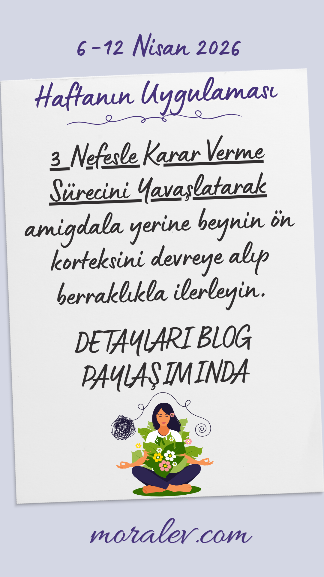 Bu hafta önemli bir karar veya hareketten ya da ne zaman o aciliyet hissini, o panik benzeri baskılı duyguyu hissederseniz, önce “3 Nefeslik Duraklama” uygulayın: