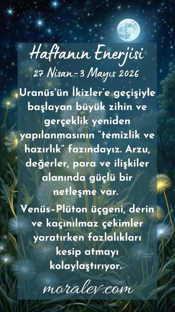 Yarın Uranüs’ün İkizler girişini konuşacağız, haftanın ilerleyen günlerinde ise Akrep dolunayına odaklanacağız. Çok ilginç bir Sabian sembolü var ve çektiğim kart ise “Sözden Dünyaya”. Yani bence bu dolunayda tek yapacağımız şey arınmak değil, bence bol miktarda yaratım desteği de olacak!